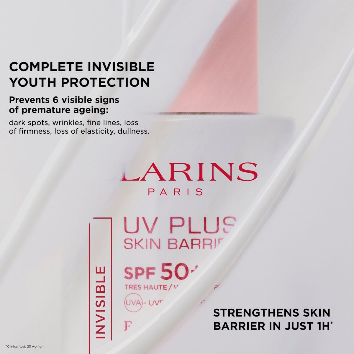 Létt, olíulaus sólarvörn með breiðvirkri vörn, SPF50. Formúlan inniheldur Anti-Pollution Complex frá Clarins og ver húðina með þrefaldri virkni; gegn UVA- og UVB-geislum, mengun og sindurefnum. Ósýnileg vörn UV Plus hjálpar til við að koma í veg fyrir ótímabæra öldrun húðarinnar. Silkimjúk áferðin rennur auðveldlega inn í húðina án þess að skija eftir hvíta slikju og hentar varan því fullkomlega undir farða.