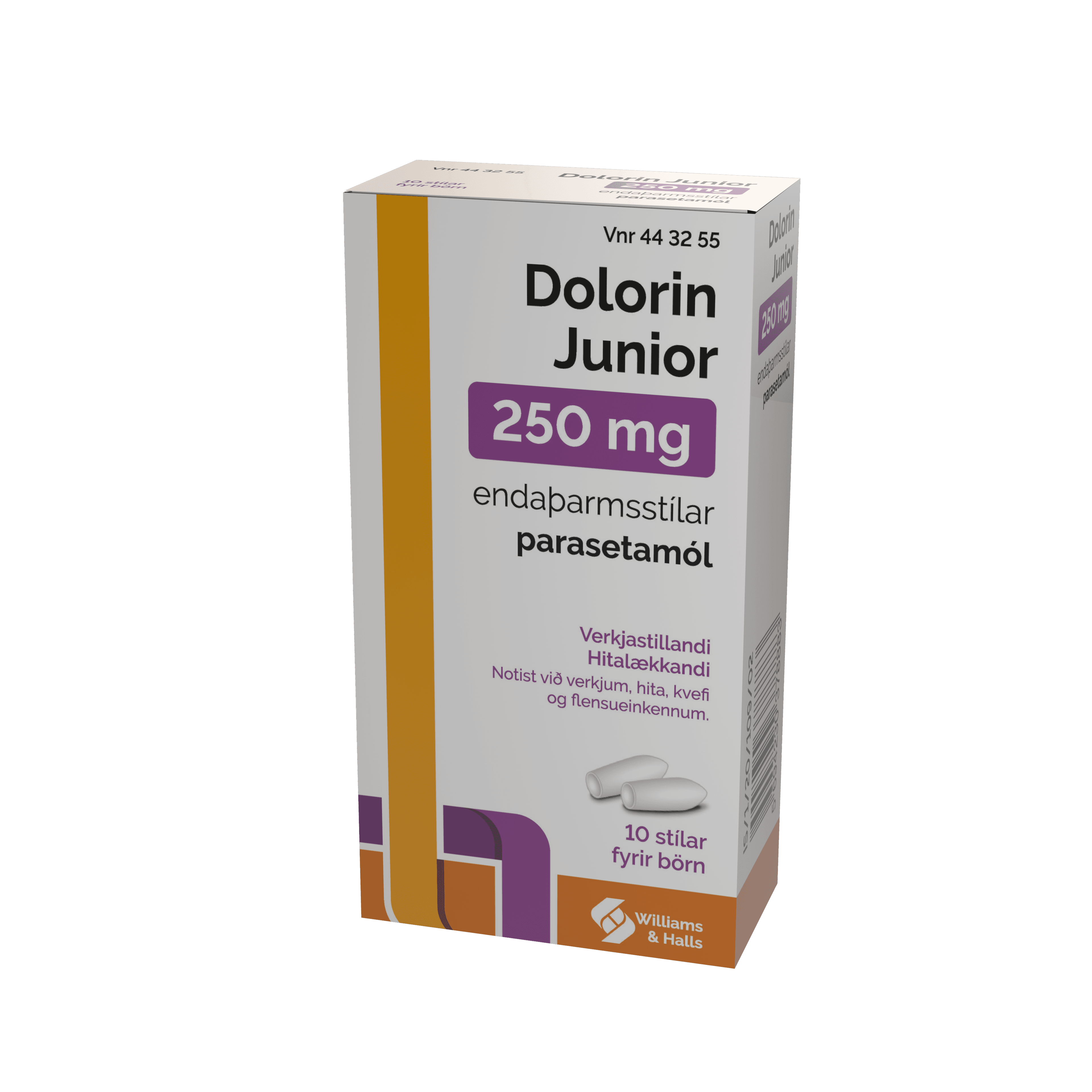 Dolorin Junior 250 mg stílar börn (þyngri en 10 kg): Einn 250 mg stíll allt að 4 sinnum á sólarhring. Lesið vandlega upplýsingar á umbúðum og fylgiseðli fyrir notkun lyfsins. Leitið til læknis eða lyfjafræðings sé þörf á frekari upplýsingum um áhættu og aukaverkanir. Sjá nánari upplýsingar um lyfið á sérlyfjaskrá