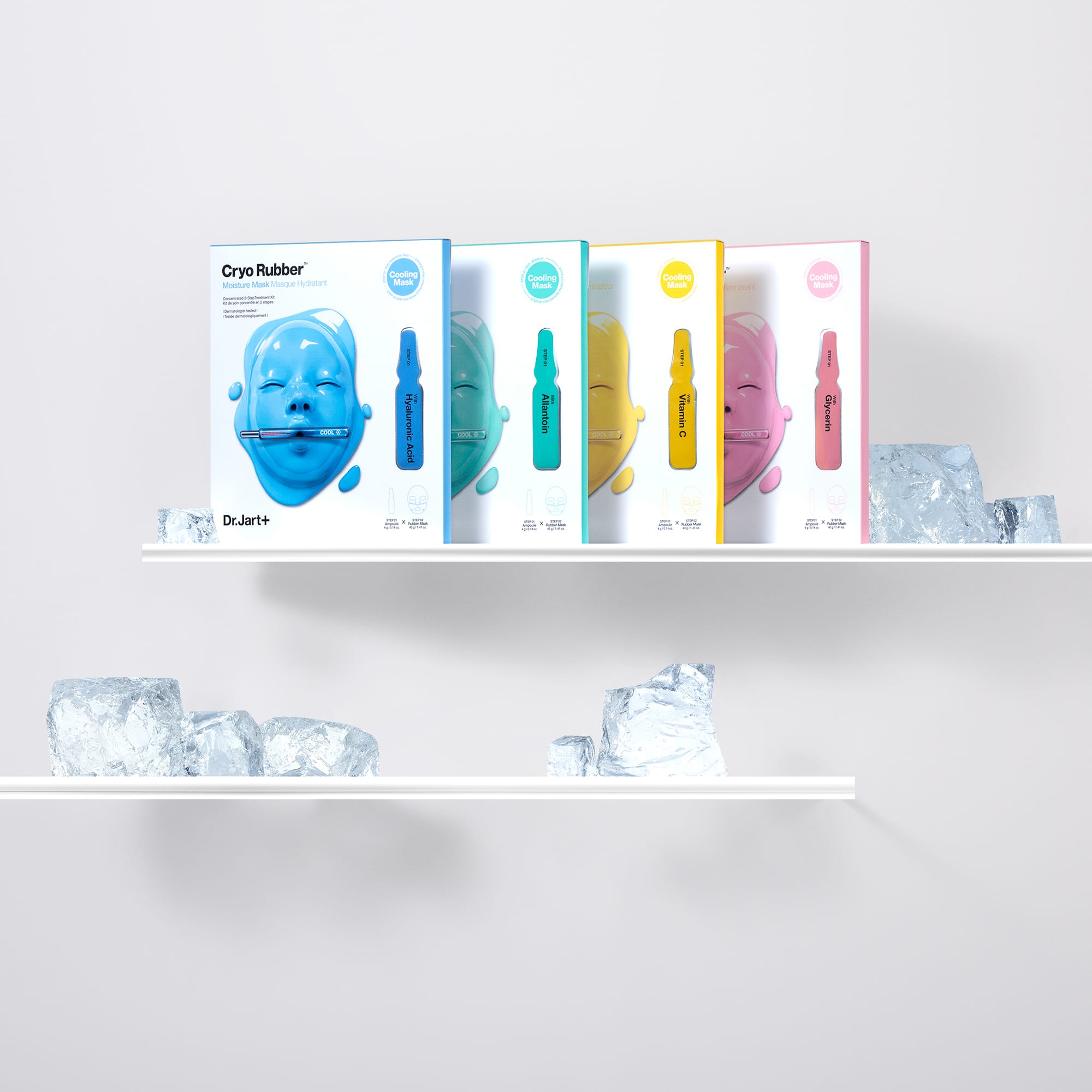 STEP 01 DR.JART ALLANTOIN 1000 PPM AMPOULE AQUA, DIPROPYLENE GLYCOL, GLYCERIN, CAPRYLIC/CAPRIC TRIGLYCERIDE, BUTYLENE GLYCOL, NIACINAMIDE, 1,2-HEXANEDIOL, PEG- 240/HDI COPOLYMER BIS-DECYLTETRADECETH-20 ETHER, GLYCERYL STEARATE, PEG-100 STEARATE, DIMETHICONE, GLYCERETH-26, HYDROXYETHYL ACRYLATE/SODIUM ACRYLOYLDIMETHYL TAURATE COPOLYMER, ISOHEXADECANE, ALLANTOIN, TREHALOSE, GLYCERYL ACRYLATE/ACRYLIC ACID COPOLYMER, ETHYLHEXYLGLYCERIN, BETAINE, DISODIUM EDTA, POLYSORBATE 60, SORBITAN ISOSTEARATE, MELIA AZADIRACHTA LEAF EXTRACT, MELIA AZADIRACHTA FLOWER EXTRACT, TOCOPHEROL, POTASSIUM LAURATE, MACADAMIA TERNIFOLIA SEED OIL, MANGIFERA INDICA SEED BUTTER, SORBITAN SESQUIOLEATE, CETYL ALCOHOL, STEARYL ALCOHOL, ALLIUM CEPA BULB EXTRACT, ASPARAGUS OFFICINALIS EXTRACT, BRASSICA OLERACEA CAPITATA LEAF EXTRACT, CYNARA SCOLYMUS LEAF EXTRACT, MUSA SAPIENTUM FRUIT EXTRACT, UNDARIA PINNATIFIDA EXTRACT STEP 02 DR.JART CRYO RUBBER SOOTHING MASK AQUA, METHYLPROPANEDIOL, CHONDRUS CRISPUS EXTRACT, GLYCERIN, CERATONIA SILIQUA GUM, POTASSIUM CHLORIDE, XANTHAN GUM, DIPROPYLENE GLYCOL, HYDROXYACETOPHENONE, SUCROSE, CAPRYLYL GLYCOL, ALGIN, PANTHENOL, POLYGLYCERYL-10 LAURATE, CI 77891, MELIA AZADIRACHTA LEAF EXTRACT, ALLANTOIN, CALCIUM CHLORIDE, MELIA AZADIRACHTA FLOWER EXTRACT, DIPOTASSIUM GLYCYRRHIZATE, COCCINIA INDICA FRUIT EXTRACT, ETHYLHEXYLGLYCERIN, DISODIUM EDTA, SODIUM CITRATE, ALOE BARBADENSIS FLOWER EXTRACT, SOLANUM MELONGENA FRUIT EXTRACT, CITRIC ACID, XYLITYLGLUCOSIDE, OCIMUM SANCTUM LEAF EXTRACT, 1,2-HEXANEDIOL, ANHYDROXYLITOL, CORALLINA OFFICINALIS EXTRACT, CURCUMA LONGA ROOT EXTRACT, XYLITOL, CENTELLA ASIATICA EXTRACT*, GLUCOSE, HYDROGEN DIMETHICONE, TOCOPHEROL, DIATOMACEOUS EARTH, KAOLIN. Please be aware that ingredient lists may change or vary from time to time. Please refer to the ingredient list on the product package you receive for the most up to date list of ingredients.
