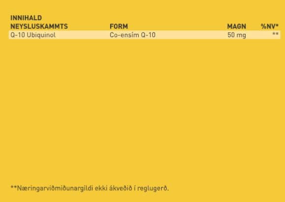 Innihald í 1 hylki: Ubiquinol (reduced coQ10) 50mg. Önnur innihaldsefni: Medium chain triglycerides, gelatín, glycerin, ascorbyl palmitate, hreinsað vatn, soja lesitín, bývax og sólblómaolía.