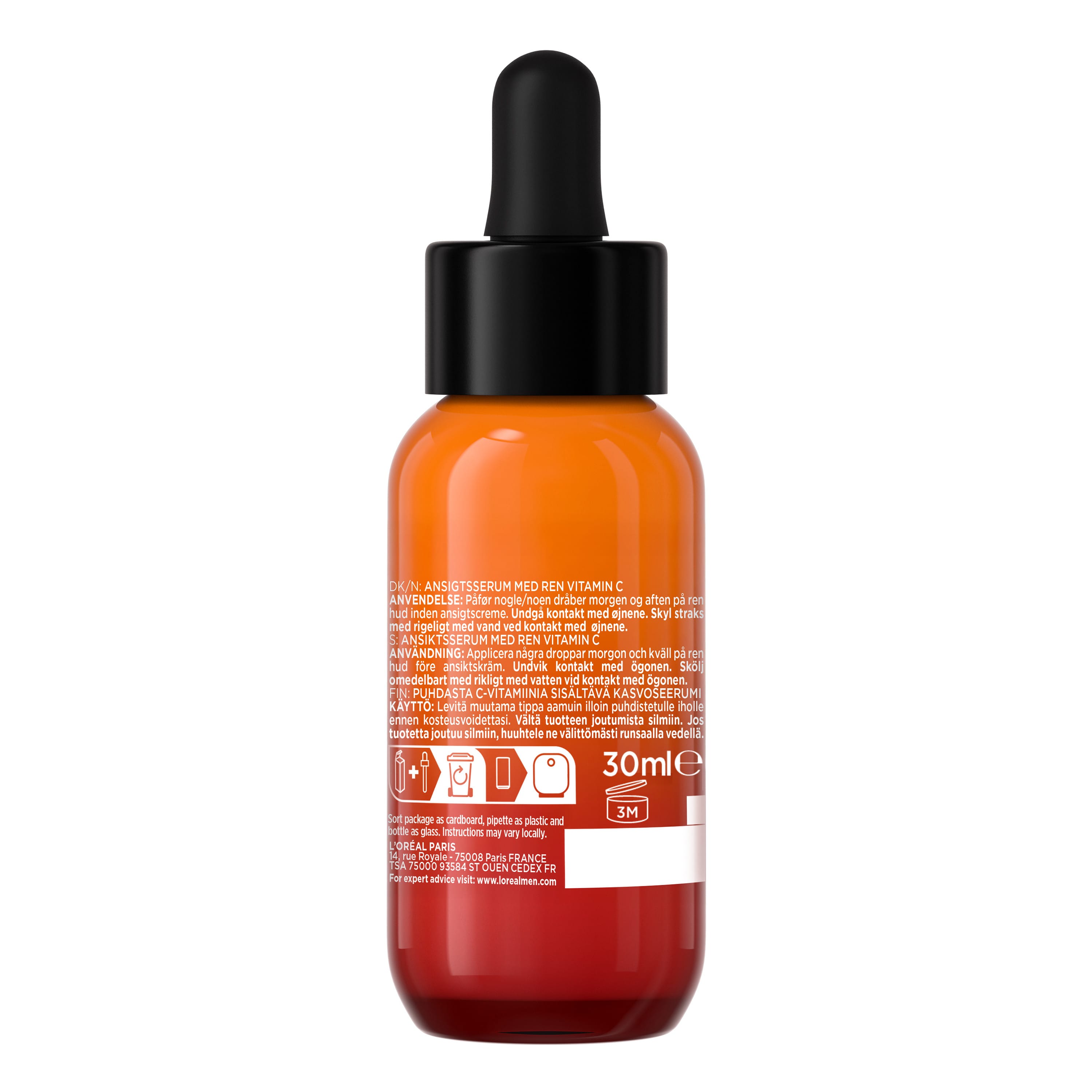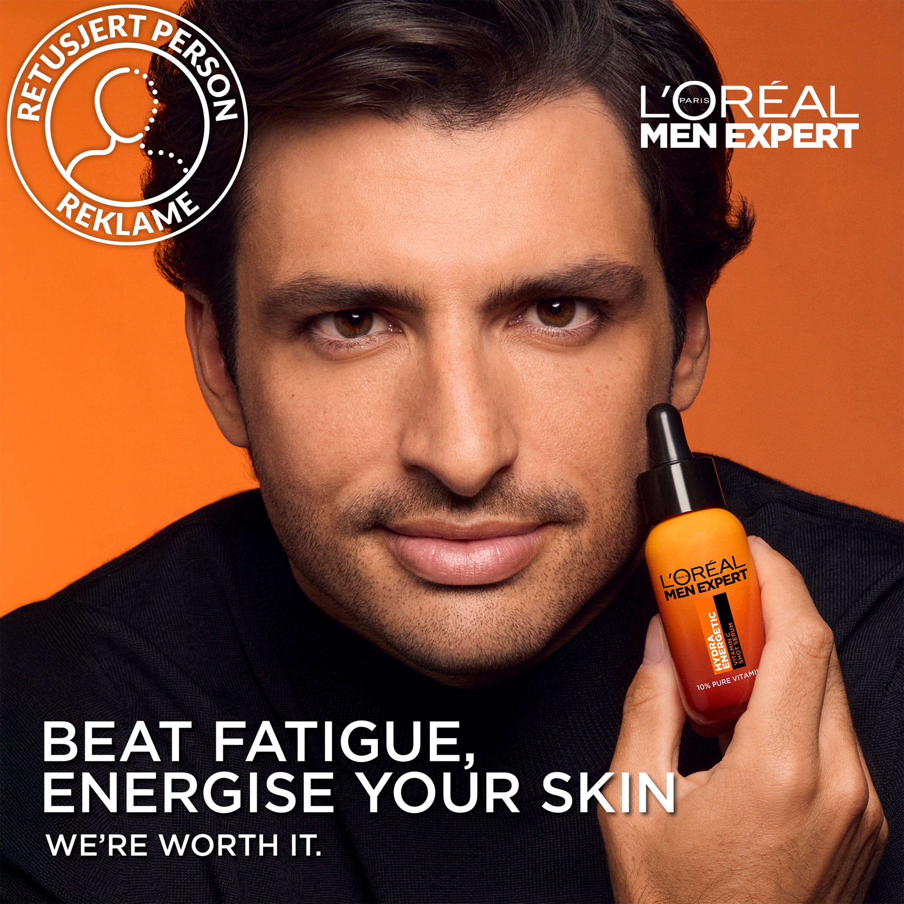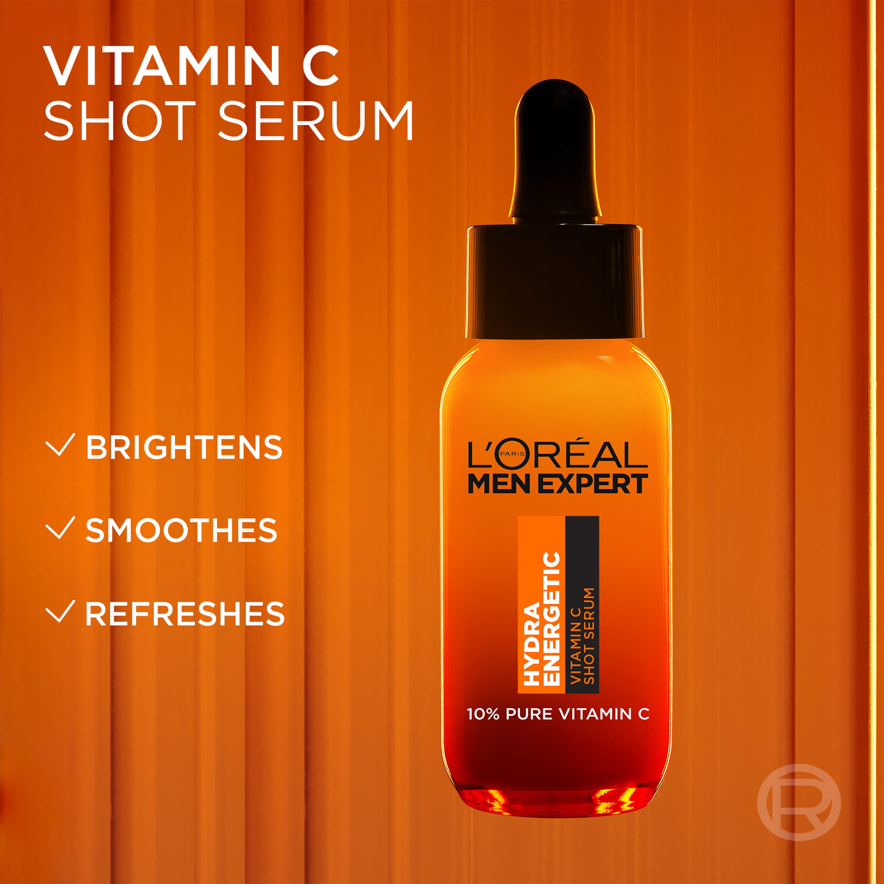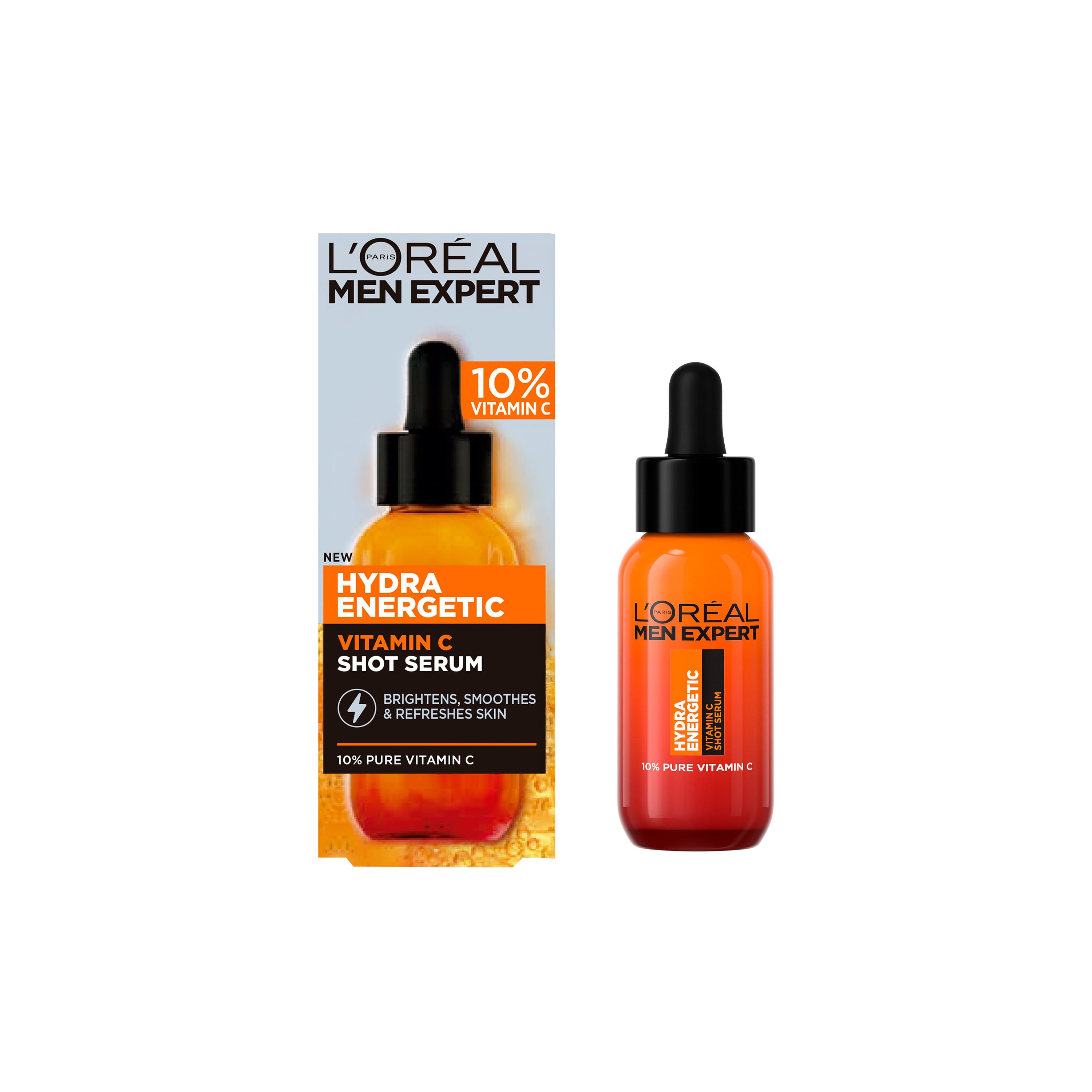 L'Oréal Paris Men Expert Hydra Energetic Vitamin C Serum er andlitsserum fyrir karla og inniheldur 10% hreint C-vítamín. Létt formúlan vinnur á þrjá vegu: endurlífgar líflausa húð, sléttir húðina og veitir langvarandi raka. Svitaholur minnka og serumið veitir frískandi tilfinningu.