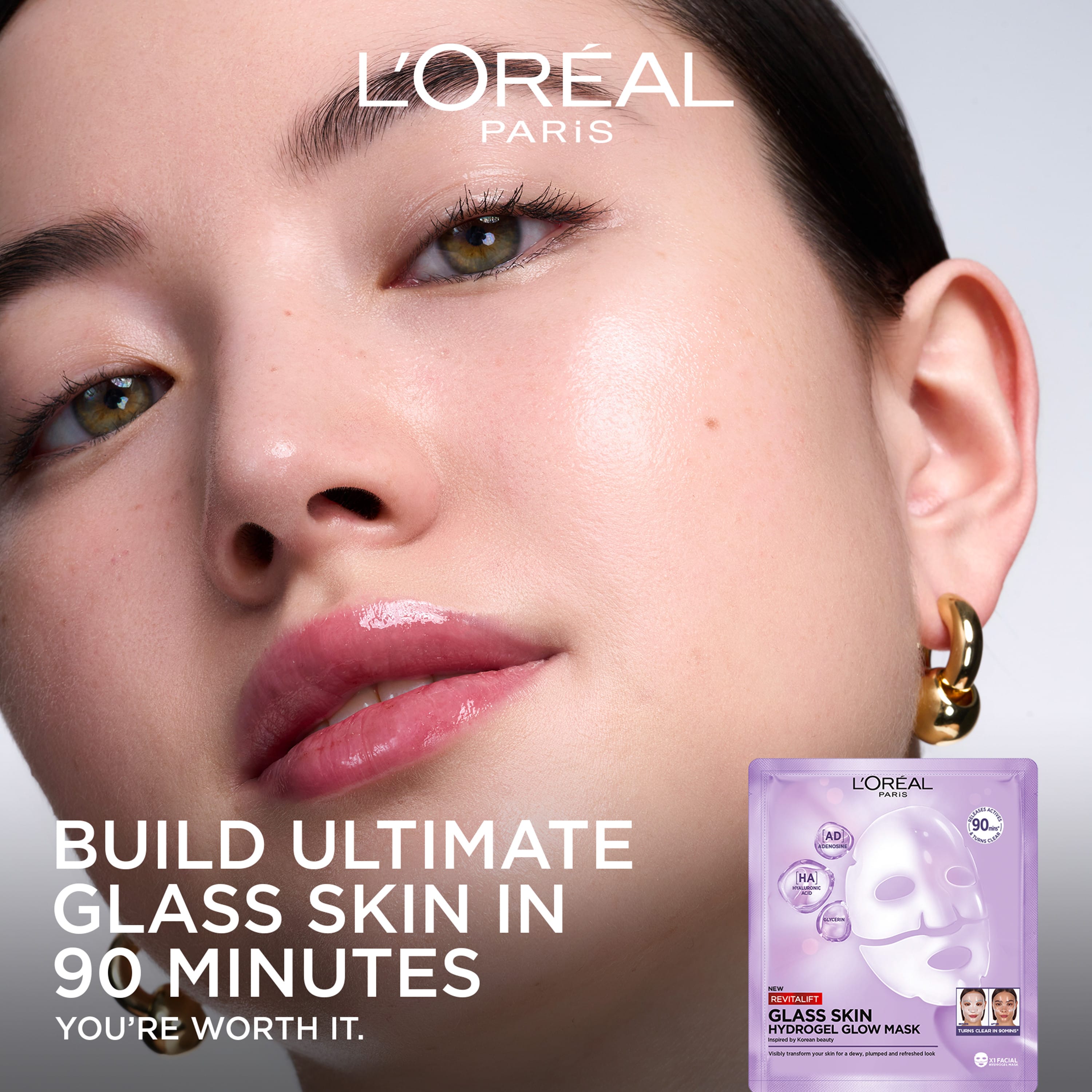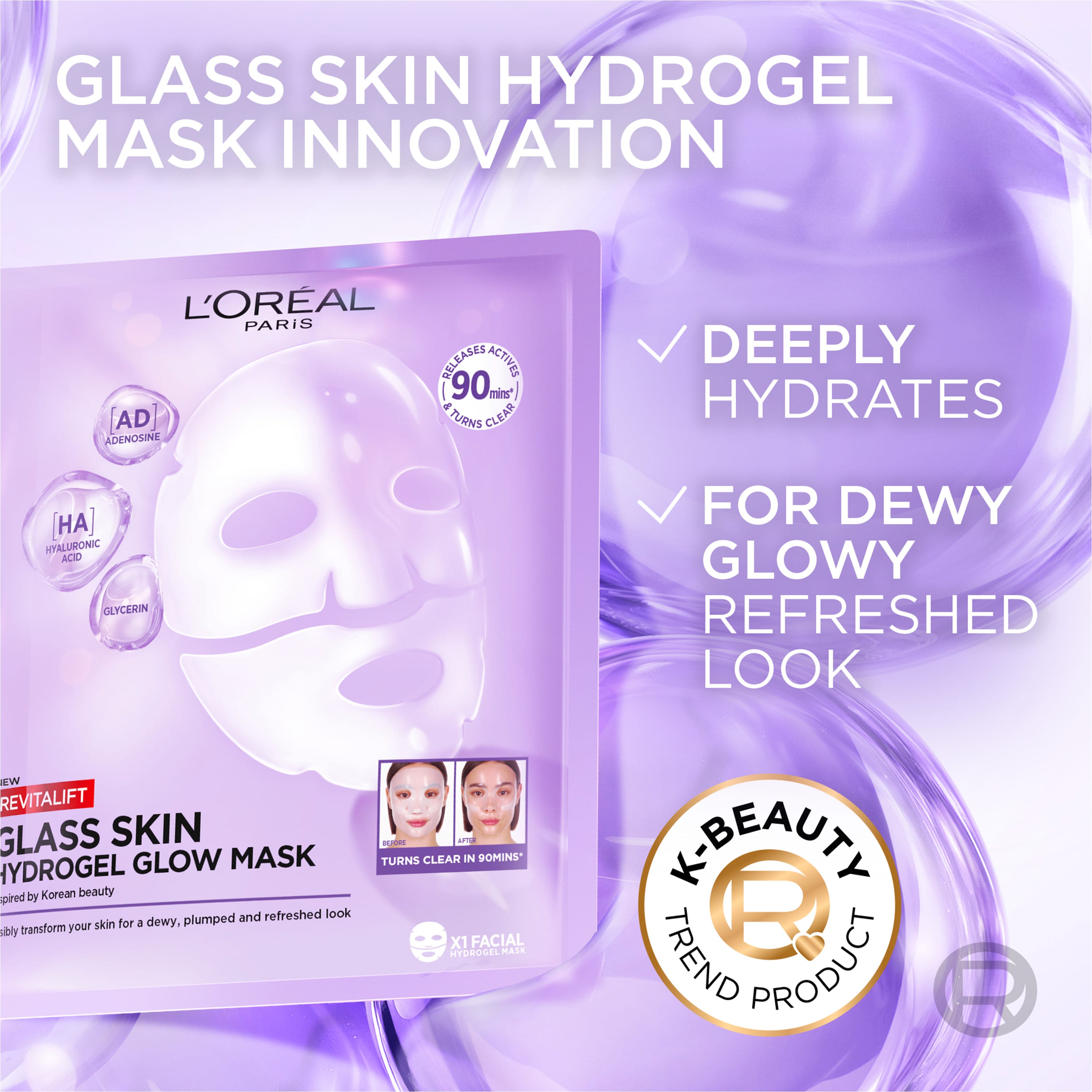 L'Oréal Paris Revitalift Filler Glass Skin Hydrogel Sheet Mask er andlitsmaski sem hentar öllum húðgerðum, líka viðkvæmri húð. Maskinn er innblásinn af kóreskri húðumhirðu og verður nánast ósýnilegur á húðinni eftir 90 mínútur. Ríkur af Centella Asiatica þykkni, róandi panthenóli og virkum húðmeðferðarefnum á borð við hyalúrónsýru, adenosín og glýserín. Maskinn veitir húðinni raka og ljóma á aðeins 90 mínútum!