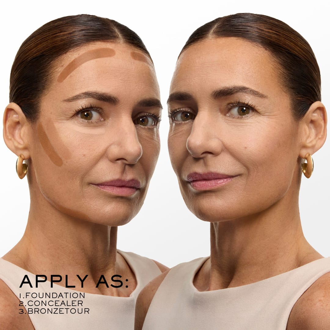• Berið beint á hreina og rakagefna húð með því að strjúka yfir enni, kinnar, nef og höku fyrir jafna þekju. • Notið lítið magn á ákveðin svæði, eins og bólur eða undir augum, til að hylja og leiðrétta. • Berið meðfram kinnbeinum, kjálkalínu eða hliðum nefs til að móta og skerpa andlitsdrætti. • Blandið með fingrum, bursta eða svampi þar til æskileg þekja og útkoma næst.