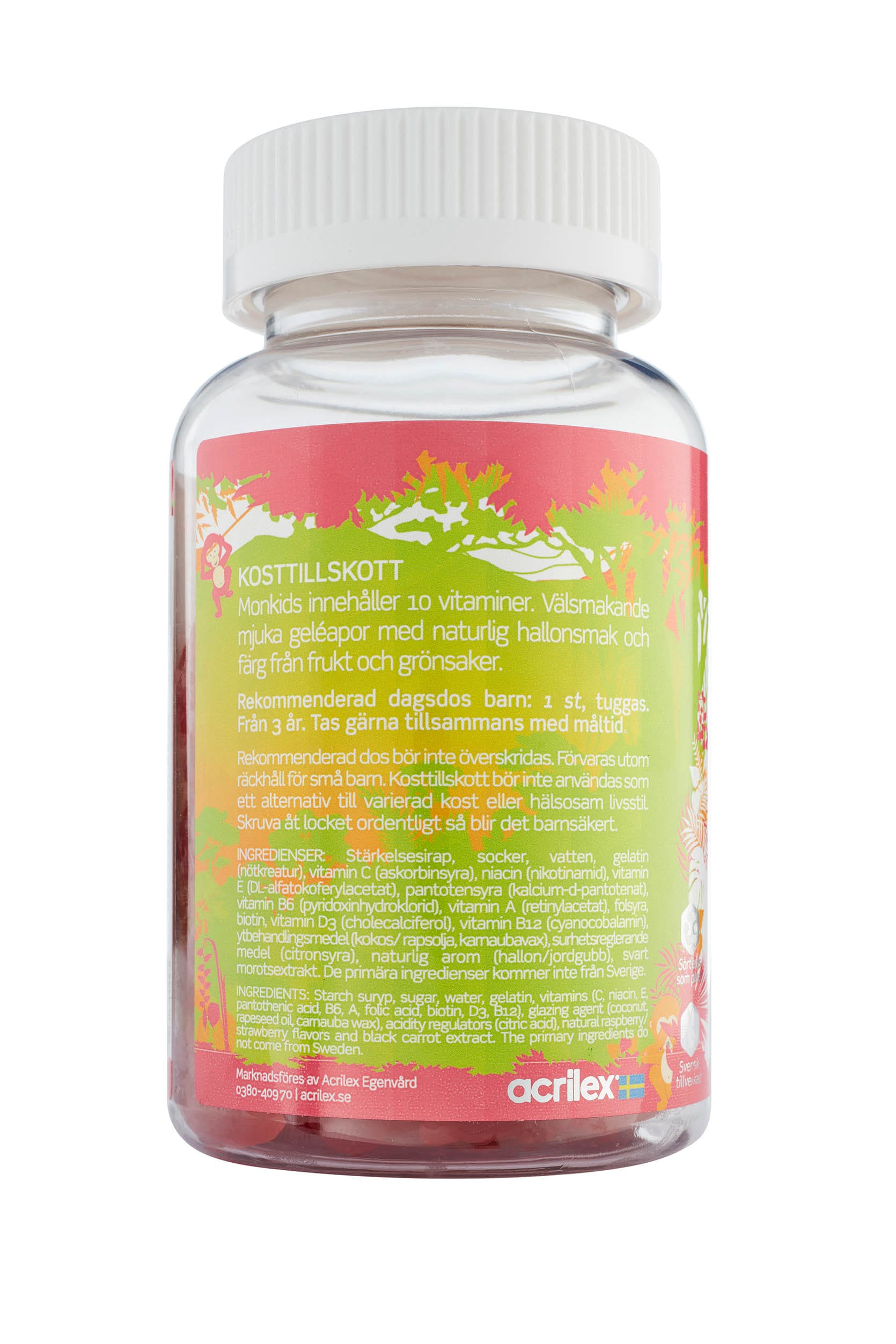 Glucose syrup, sugar, water, gelatin (bovine), vitamin blend (vitamin C (ascorbic acid), vitamin E (DL-alpha tocopheryl acetate), niacin/vitamin B3 (nicotinamide), vitamin D3 (cholecalciferol), vitamin A (retinyl acetate), biotin, pantothenic acid (calcium-D-pantothenate), folic acid (pteroylmonoglutamic acid), vitamin B6 (pyridoxine hydrochloride), vitamin B12 (cyanocobalamin)), acidity regulator (citric acid), natural flavor (strawberry, raspberry), black carrot extract, vegetable oil (coconut, rapeseed), glazing agent (carnauba wax). The primary ingredients (vitamins) do not come from Sweden.