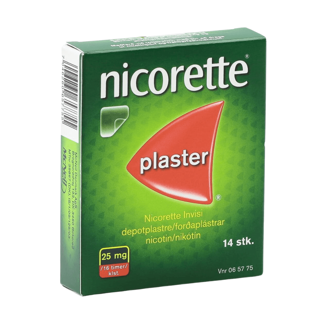 Nicorette inniheldur nikótín. Plásturinn er settur á þurrt, hárlaust svæði, eins og mjöðm og hann fjarlægður eftir 16 klst. Skipt er um svæði á líkamanum eftir dögum. Pakkinn inniheldur 14 stk af 25 mg plástrum