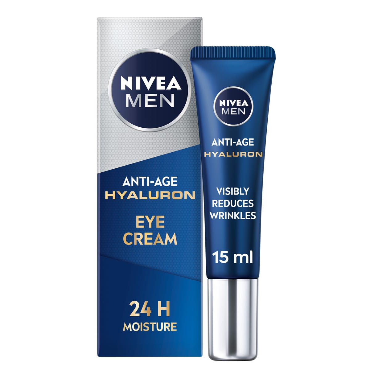 Dregur sýnilega úr djúpum hrukkum á viðkvæmu augnsvæðinu - Þéttir húðina í kringum augun - Dregur úr augnpokum og þreytueinkennum. Fyrstu merki um öldrun? NIVEA MEN Anti-Age Eye Cream með hýalúrónsýru – er hin fullkomna andlitsvara fyrir karlmenn sem vilja heilbrigða og unglega húð. Þessi áhrifaríka formúla sem inniheldur hýalúrónsýru, hefur verið sérstaklega hönnuð til að draga úr augnpokum og þreytumerkjum. Það dregur sýnilega úr djúpum hrukkum og þéttir húðina á viðkvæma augnsvæðinu á áhrifaríkan hátt, og veitir 24 klst raka. Húðsamhæfni húðfræðilega samþykkt. Gefur heilbrigt og unglegra útlit. Frásogast hratt og skilur ekki eftir fituleifar á húðinni.