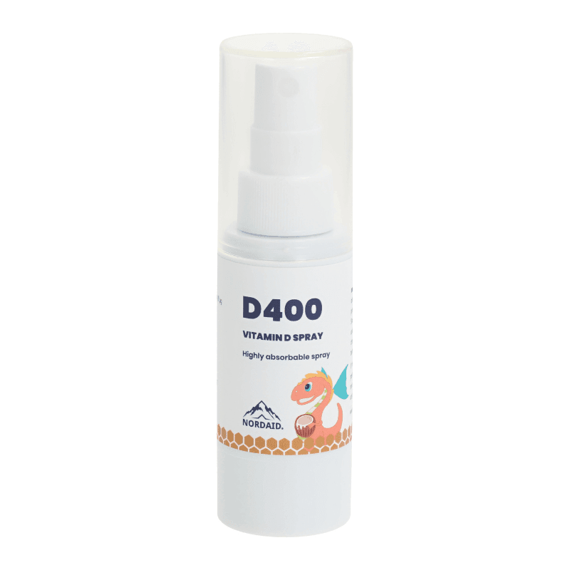 Munnúði fyrir ungabörn og börn. · Einstaklega bragðgóður munnúði sem frásogast og nýtist hratt og vel. · Einfalt og þæginlegt. · Sykurlaust. · Vegan. Nordaid's D400iu með MCT unna úr kókosolíu stuðlar að viðhaldi eðlilegra tanna og beina. Einnig stuðlar D vítamín að eðlilegri starfsemi ónæmiskerfisins. D vítamín stuðlar einnig að eðlilegri upptöku/notkun kalsíums og fosfórs ásamt kalsíummagni í blóði. Munnúðinn nýtist líkamanum allt að 50% betur en hefðbundnar töflur og hylki, þar sem innihaldið frásogast beint í gegnum slímhúð munnhols og út í blóðrásina. Úðinn inniheldur 200 dagskammta í 30 ml. glasi. Fæðubótarefni kemur aldrei í staðinn fyrir fjölbreytt og gott mataræði. Varist að nota ekki meira en ráðlagður dagskammtur segir til. Geymist við stofuhita og ekki í sólarljósi.