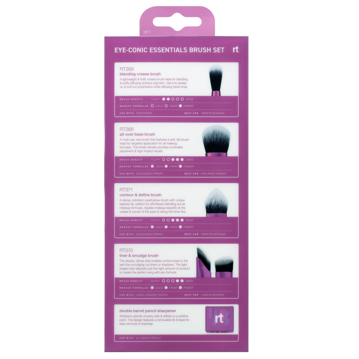 Real Techniques Eye-Conic Essentials er fjögurra bursta augnförðunarsett. Inniheldur: RT 369 Blending Crease Brush, RT 368 All-Over Base Brush, RT 371 Contour & Define Brush, RT 370 Liner & Smudge Brush and Double Barrel Pencil Sharpener