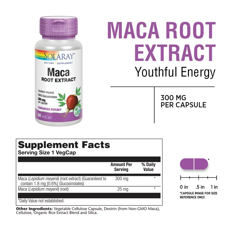 Maca (Lepidium spp) (root extract) 300mg, Maca (Lepidium spp.) (Root) 25mg