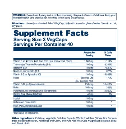 Vitamin C, Thiamine, Riboflavin, Niacin, Vitamin B-6, Folic Acid, Vitamin B-12, Biotin, Pantothenic Acid, Choline, Inositol, Bioflavonoid Concentrate, PABA (Para-Aminobenzoic Acid)