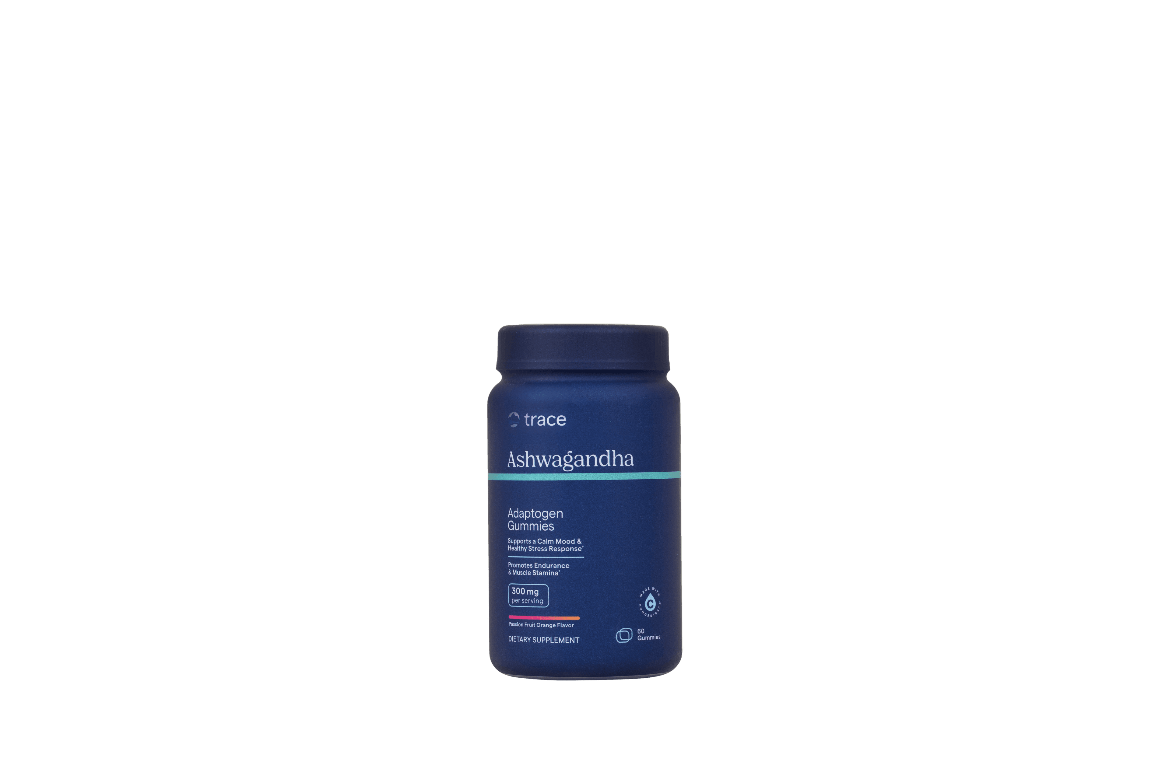 Innihald í einum skammti: Ashwagandha root extract 300 mg Vítamín D3 25 mcg(1000IU) Sodium (Sodium Citrate) 10 mg Added sugar 2 g Önnur innihaldsefni: Lífrænn sykur, lífrænt tapíókasíróp, pektín, sítrónusýra, náttúruleg bragðefni (ástríðualdinolía, appelsínugult, náttúrulegt bragð), tumeric (Curcuma longa) og appelsínugul paprika (litur), natríumsítrat.