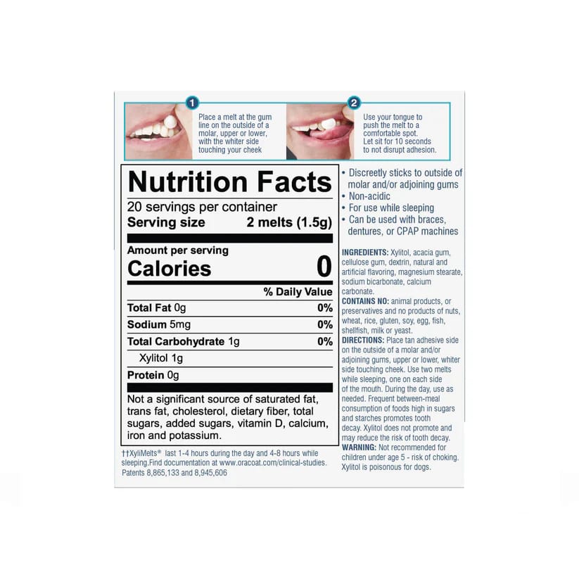 Viltu losna við munnþurrk allan sólarhringinn? XyliMelts eru litlar töflur sem loða við tennur, góm eða kinn og gefa frá sér xylitol (náttúrulega sykru) sem örvar munnvatnsflæði, kalsíum sem endurkalkar tennur og bíkarbónat sem hlutleysir sýrur í munninum.