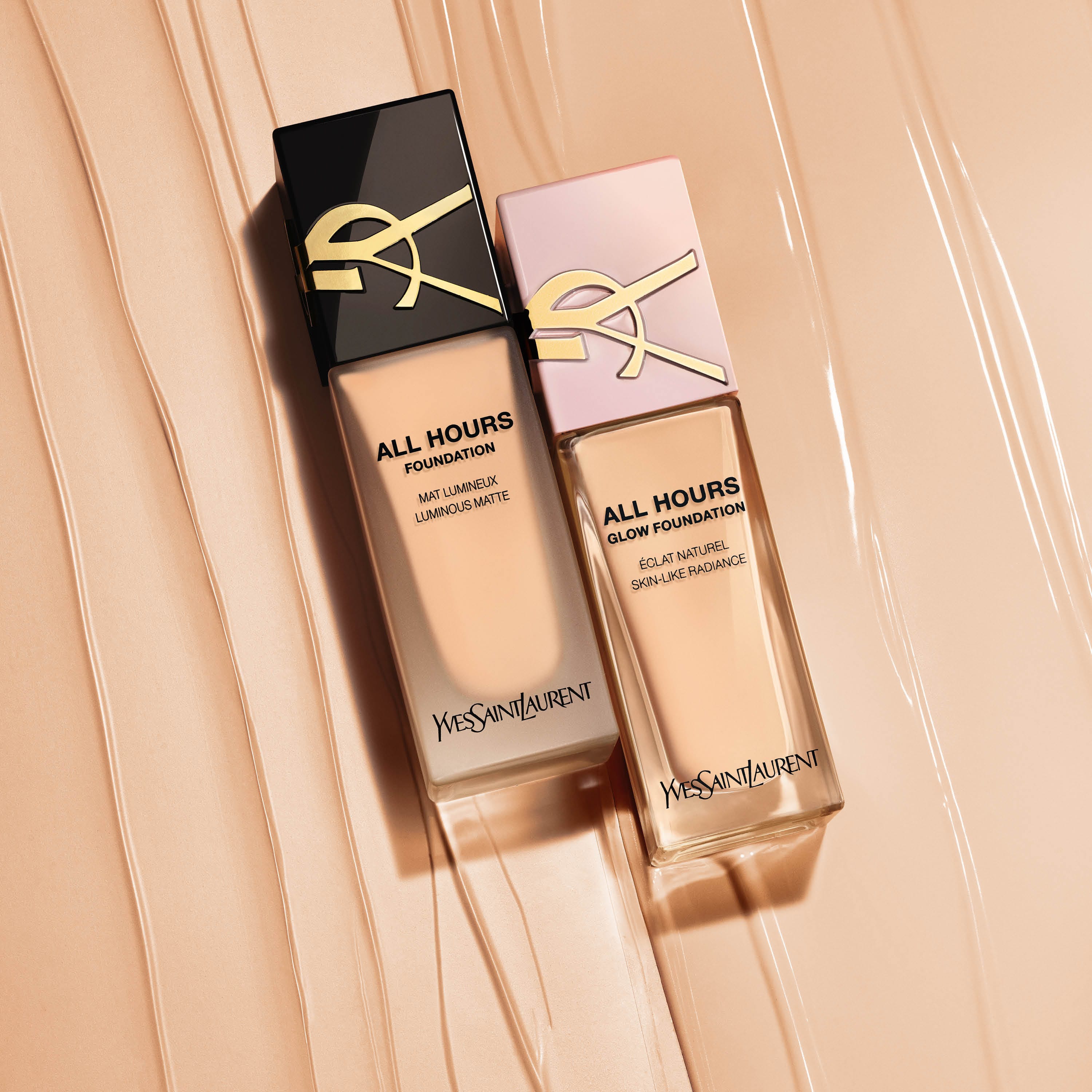 ALL HOURS GLOW – LJÓMANDI FARÐI FYRIR DAG OG KVÖLD Upplifðu All Hours Glow Foundation, endingargóðan ljómafarða frá Yves Saint Laurent Beauty með fullkominni og ljómandi couture áferð. Húðin verður samstundis jafnari, sléttari og meira ljómandi. Létt formúlan veitir uppbyggjanlega þekju, 24 klst. endingu* og fallegan ljóma. Nærandi serum-formúlan er rík af hýalúrónsýru og níasínamíði. Húðin virkar ljómandi og fylltari – jafnvel án farða.
